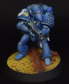 Warhammer 40,000 is a miniature wargame, where Space Marines are one of the playable factions that can be used. They are the most well-known and popular characters in Warhammer 40,000, always featuring in the artwork and starter set of each edition of Warhammer 40,000 and other spin-off games such as Space Hulk and Epic (excluding the 2nd edition Titan Legions), and simpler derivative games such as Space Crusade. Likewise, they are the most popular protagonists in spin-off fiction such as novels and video games.