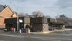 The largest above ground structure is the bus station; its main entrance, along with elevators and a fare collector booth, is located on the east side of Spadina Road just north of Bloor Street, which currently serves as the terminus of the 127 Davenport bus route. Originally, it was built to serve as a looping facility for the former 77 Spadina bus which operated until the underground streetcar loop was added and the buses were replaced by 510 Spadina streetcars. This building, with its pseudo-mansard roof and brick arches and no obvious bold signage like most other station entrances, is located at the easterly end of the Bloor line platforms. There is a secondary entrance building directly opposite, on the west side of Spadina Road, which is only accessible to those with Presto cards.