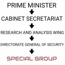 The Special Group functions under the Directorate General of Security (DG Security) of Research and Analysis Wing (RAW), which is India's foreign intelligence agency.[5][18] The unit serves under the command of the prime minister through the Cabinet Secretariat.[2][6] Within RAW, the Secretary (Research) is responsible for the Special Group.[19]