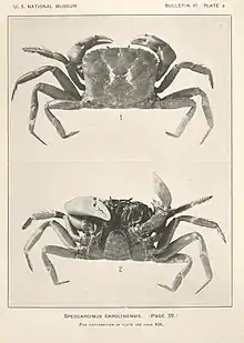 - ↑ Annette B. Tucker; Rodney M. Feldmann & Charles L. Powell II (1994). "Speocarcinus berglundi n. sp. (Decapoda: Brachyura), a new crab from the Imperial Formation (Late Miocene–Late Pliocene) of Southern California". Journal of Paleontology. 68 (4): 800–807. JSTOR 1306148.