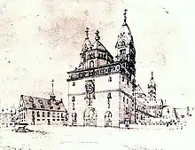 In the following centuries the cathedral remained relatively unchanged. In a drawing of 1610 a Gothic chapel has been added to the northern aisle, and in a drawing of around 1650 there is another Gothic window in the northern side of the Westwerk. In a drawing of 1750 depicting the cathedral with the destroyed middle section the latter window is absent. File: