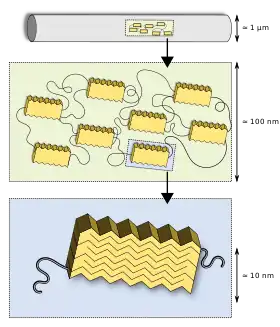 Silks, like many other biomaterials, have a hierarchical structure. The primary structure is the amino acid sequence of its proteins (spidroin), mainly consisting of highly repetitive glycine and alanine blocks,[4][5] which is why silks are often referred to as a block co-polymer. On a secondary structure level, the short side chained alanine is mainly found in the crystalline domains (beta sheets) of the nanofibril, glycine is mostly found in the so-called amorphous matrix consisting of helical and beta turn structures.[5][6] It is the interplay between the hard crystalline segments, and the strained elastic semi-amorphous regions, that gives spider silk its extraordinary properties.[7][8] Various compounds other than protein are used to enhance the fibre's properties. Pyrrolidine has hygroscopic properties which keeps the silk moist while also warding off ant invasion. It occurs in especially high concentration in glue threads. Potassium hydrogen phosphate releases hydrogen ions in aqueous solution, resulting in a pH of about 4, making the silk acidic and thus protecting it from fungi and bacteria that would otherwise digest the protein. Potassium nitrate is believed to prevent the protein from denaturing in the acidic milieu.[9]
