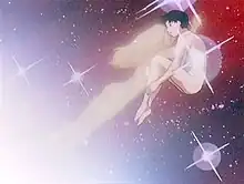 The scene in which Shinji is trapped inside Leliel uses experimental animation techniques. The crew depicted Shinji's face distorted with a fisheye effect with a sunset in the background in the scene, a technique that Newtype magazine compared to Ultraman.[40] Evangelion Chronicle magazine similarly compared the sequence of Shinji floating into space seeing his mother to Mobile Suit Gundam, in which the protagonist Amuro Ray and Lalah Sune are seen communicating while floating in a sea of light.[41][42] The voice of Shinji and the other Shinji, Leliel itself, is expressed through white lines that move on a black background, with only the voice of the voice actress in the background.[43] Anno wanted to create images with just voices with a minimum amount of visual information.[44] According to him, since animation is made of graphic symbols and is a fiction, "a lie from the beginning", using rough drawings without using celluloid would have allowed him to destroy the stereotypes of people who think that only traditional celluloid animation can be considered a finished product.[45] Tsurumaki originally took inspiration from a scene at the end of the Royal Space Force: The Wings of Honnêamise film (1987); he initially wanted to make a scene in which in the midst of a dizzying vortex of images all the people from Shinji's past memories spoke, but it was impossible to make it happen and Anno didn't like it. Anno, on the other hand, found the idea of using lines brilliant, since "no one had done something similar before".[46]