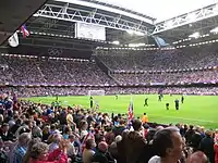 Cardiff plays host to many high-profile sporting events at a local, national and international level.[3][4] In recognition of the city's commitment to sport for all, Cardiff was awarded the title of European City of Sport 2009.[5] Organised sports have been held in the city since the early 19th century.[6] Cardiff Arms Park (Welsh: Parc yr Arfau Caerdydd), in central Cardiff, is among the world's most famous venues—being the scene of three Welsh Grand Slams in the 1970s (1971, 1976 and 1978) and six Five Nations titles in nine years – and was the venue for Wales' games in the 1991 Rugby World Cup.[7][8][9][10] The Arms Park has a sporting history dating back to at least the 1850s, when Cardiff Cricket Club (formed 1819) relocated to the site.[6] The ground was donated to Cardiff CC in 1867 by the Marquess of Bute. Cardiff Cricket Club shared the ground with Cardiff Rugby Football Club (founded 1876)—forming Cardiff Athletic Club between them—until 1966, when the cricket section moved to Sophia Gardens. Cardiff Athletic Club and the Welsh Rugby Union established two stadia on the site—Cardiff RFC played at their stadium at the northern end of the site, and the Wales national rugby union team played international matches at the National Stadium, Cardiff Arms Park, which opened in 1970. The National Stadium was replaced by the 74,500 capacity Millennium Stadium (Welsh: Stadiwm y Mileniwm) in 1999—in time for the 1999 Rugby World Cup—and is home stadium to the Wales national rugby and football teams for international matches.[6][7][11][12] In addition to Wales' Six Nations Championship and other international games, the Millennium Stadium held four matches in the 2007 Rugby World Cup and six FA Cup finals (from the 2000–01 to 2005–06 seasons) while Wembley Stadium was being rebuilt.[8]