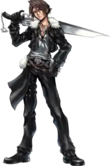 Squall Leonhart (Japanese: スコール・レオンハート, Hepburn: Sukōru Reonhāto) is a character and the protagonist of Final Fantasy VIII, a role-playing video game that was produced by Square (now Square Enix). Within the game's plot, Squall is a 21-year-old student at Balamb Garden, a prestigious military academy for elite mercenaries (known as "SeeDs"). Forced into becoming the Commander (委員長, Iinchō, lit. "Chairman") due to his outstanding skills, Squall befriends his underlings, and falls in love with Rinoa Heartilly. These relationships, combined with the game's plot, gradually change him from being a loner to an open, caring person. Squall has appeared in several other games, including Chocobo Racing, Itadaki Street Special, and the Kingdom Hearts series as the older mentor-like figure named Leon (レオン, Reon).