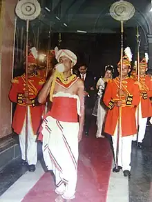 Sri Lankan military bands (Sinhala: ශ්රී ලංකා යුද හමුදා කණ්ඩායම) refer to the joint-service musical units of the Sri Lanka Armed Forces representing the Sri Lanka Army, the Sri Lanka Navy, and the Sri Lanka Air Force. The three bands mentioned, which were established in 1949, 1952 and 1970 respectively and are the seniormost in the armed forces. They are composed of many ceremonial marching bands as well as concert bands which are base for the band's success. The band participates in main social and cultural events, including formal state visits and military parades. All army regiments also contain a regimental band for ceremonial duties.[1][2]