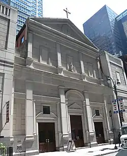 The church has suffered two fires. The first, which badly damaged it but left the towers standing, occurred on December 24, 1898. The following February, plans were filed to rebuild it and add a semi-octagonal chancel to the rear, at the expected total cost of $40,000 ($1,400,000 in current dollars).[11] The second fire, on December 10, 1992, left only the outside walls and the towers standing,[12] costing $2 million for demolition ($4.2 million current) and $6 million for the new building ($12.5 million current).[9] The church was rebuilt to designs by the firm Acheson, Thornton, Doyle, and opened in 1998. The new church was modeled after the Church of the Gesù in Rome, but with the original towers from O'Connor's church flanking the new building.[1][2][13]