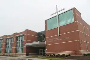 As the newest secondary school, it is equipped with new technology throughout the school. The school cost $27 million to build, and totals 135,000 square feet.[2] The school is completely wireless, and trying to be paperless. The main staircase is used as a hangout for the students, with plugs built in it. Some of the specialty classrooms include a health-care technology course, an exercise room, dance studio, music, arts, drama room, etc.[3]