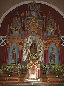 The high altar of the church extends almost to the roof, and carries statues of Sacred Heart, Our Lady and St Andrew. Smaller statues of St John the Baptist, St Sebastian and the Bom Jesu are above the main statues.[7] The 16th-century wood side altars were carved and painted in popular Portuguese style. The church also has 16th-century hanging wood panels depicting the Resurrection of the Christ and the Assumption of Mother Mary, and a 16th-century pulpit. One of the largest and oldest stone crosses in Mumbai is in its compound. This stone cross is carved from a single stone. Originally installed at the older Church of St. Anne, it was moved. The Maratha Army destroyed the church during the invasion of the settlement. The Church of St. Anne was formerly at the site of the current Bandra Bus Depot.