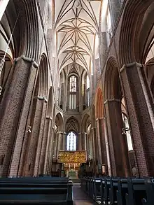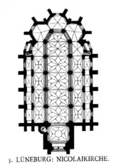 The building was erected on the site of a former chapel which the town council had initiated while other churches were built by religious orders. It served the people of the Wasserviertel and was consecrated in 1409, to Saint Nicholas.[1][2] In 1420, the town council decided to expand the chapel to a church, which was completed in 1440.[3] The church is one of the latest brick Gothic basilicas.[1] It features a prominent nave with a "star" rib vault which is unique in today Northern Germany.[3]