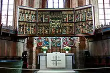 Behind the choir (Chorumgang), parts of a former high altar from the dissolved monastery Heiligenthal are shown. It features reliefs carved in Lüneburg c. 1425 and paintings from c. 1450 with four scenes from the life of the saints Laurentius and Andreas. One of the paintings contains one of the earliest views of the town. They are also attributed to Hans Bornemann.[4][5]