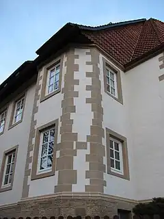 Saint Nicolas' Chapel, though today a residential building, is still recognizable as a former church which facaded to the west. It was a comparatively small church consisting of one nave with a vault.[7] The apse with its tented roof is in the east of the building. A part of the nave is preserved as well. The year 1714, which possibly refers to a renovation, is carved into the sandstone of the southern wall.