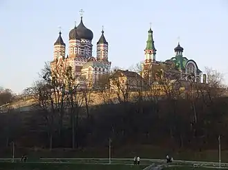 The Cathedral of St. Pantaleon or St. Panteleimon is a large Eastern Orthodox cathedral in the Kyivan neighbourhood of Feofaniia. It shares similarities with the Alexander Nevsky Cathedral, Tallinn and is considered a high point in Russian Revival ecclesiastical architecture.