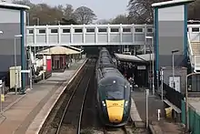 The main building is on the south side of the line, nearest the town centre and facing the bus station. It was built in 2001 to a design by Lacie Hickie Caley[16] and contains a booking office and shop. The wooden building on this platform dates from Great Western Railway days. The station car park is situated behind this platform. An accessible footbridge links the two platforms.