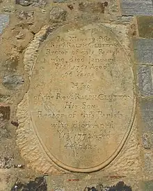 Also buried in the churchyard is Henry Piggott, a member of the locally prominent Piggot(t) family. His "seemingly very odd memorial"[9] by the southwest corner of the chancel[47] states that he was born on 30 December 1715 and died on 7 March 1715.[34] The gravestone is an example of the use of Old Style (Julian calendar) dates in the period before 1752, when the Gregorian calendar was introduced. The new year started on 25 March rather than 1 January, so Henry Piggott lived for about nine weeks.[9][34][47]
