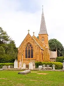 The original 6-metre (20 ft) church tower was erected in 1845 but developed a one-metre (two-foot) lean, was deemed unsafe and was dismantled in 1864. The present tower was designed by Edmund Blacket and erected during the period 1865–1870. Sandstone for the tower's window mouldings was hauled by bullock from the Camden-Bargo district, a distance of 161 kilometres (100 mi).[13] The spire was completed in 1877,[12] making the church on a hill a prominent countryside landmark.[2] The tall trees, many planted by long-serving Rector of Canberra Revd Pierce Galliard Smith, formed another landmark.[15][16]