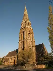 The Reverend Frederick Jeremiah Smith decided to build a new church in Taunton for the poor of the town.[2] From 1858 to 1863, St John's was built under the guidance of the eminent Victorian architect George Gilbert Scott.[1][3] Materials used included a variety of Somerset stones, including Hamstone, Bath stone and sandstone from Bishops Lydeard.[4] As the church was to be used by the poor, it did not charge pew rents: it was therefore the first Anglican church in Taunton to be free and accessible to all worshippers.[2] The church was consecrated on 13 April 1863.[1]