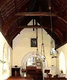 The chancel arch separating the small chancel from the larger nave is a rare example of the horseshoe form. Some good tiles on the chancel floor are notable.