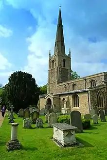 The churchyard contains many traditional headstones in the vernacular material, two table tombs, and has a goodly population of box trees and yews. Access is via a lychgate which was moved from Warboys to mark the Hemingford Millennium in 1974.[2]