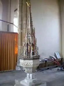 The single stemmed Decorated style octagonal font has each wave of a frieze filled with an ogee trefoil and with battlements above.[6] Suspended by a rope from the roof above is a tall and highly ornate font cover in Perpendicular Gothic style with carved figures, some original, in niches between diagonal pierced vanes with rich crocheting topped by a spire and winged angel.[14]