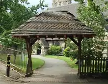 The church is set back from the main Bristol Road (A38 road) and is approached from the south by a drive, ending at a lychgate at the entrance to the churchyard.[1] There is also an entrance from the north in Lodge Hill Road.[1]