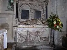 There are monuments in the church to the Burrell family, and in the south of the chancel an alabaster monument of 1616 to Sir Thomas Caryll and his family, restored about 1831 by the sculptor John Edward Carew. The composer John Ireland is buried in the churchyard, and is commemorated by a slate tablet on the south wall of the nave. In the north aisle is a tablet in memory of the German singer Anny Ahlers, who visited Shipley.[3][5]