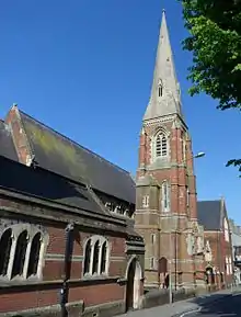 St Mary Magdalen's Church[note 1] is a Roman Catholic church in the Montpelier area of Brighton, part of the English city of Brighton and Hove. Dedicated to Jesus' companion Mary Magdalene, it is one of six Roman Catholic churches in Brighton and one of eleven in the city area. Built by ecclesiastical architect Gilbert Blount in a 13th-century Gothic style to serve the rapidly expanding residential area on the border of Brighton and Hove, it has been listed at Grade II by English Heritage in view of its architectural importance. An adjacent presbytery and parish hall have been listed separately at Grade II.