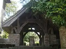 The Huth family were important in church life in the 19th and 20th centuries. Henry Huth was a bibliophile whose enormous collection of rare books was sold for £300,000 in 1910 (£32,580,000 in 2024).[17][18] He lived in an extravagant château-style 1870s house called Wykehurst Place in the parish,[19] and was buried in the churchyard after his death in 1878. In 1905, his son Edward gave the church a large, "magnificent"[1] lychgate constructed from local materials:[7] oak, millstones from a mill in the parish, Sussex Marble (a locally quarried limestone) and a Horsham Stone slab roof.[8][18] It stands at the end of the twitten leading to the churchyard, which has been left slightly overgrown to conserve wildlife.[7] A mid-19th-century rector planted the churchyard and rectory grounds with a wide range of trees, many of which survive—including Bhutan pines and oaks from Somerset.[20] There are many Victorian tombs and grave-markers in the churchyard, including some rare wooden grave-boards and some with wooden cross-pieces set between stone balls.[7] Another of Huth's sons, Alfred Henry Huth—who also became a book-collector and author, and who died in 1910—is commemorated by a memorial tablet inside the church; its style was described by Nikolaus Pevsner as "neo-late 17th-century".[10]