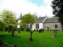 The existing church, now substantially rendered and whitewashed, consists of a nave with a separate chancel, a vestry, a tower to the west, and north and south porches.[2] The oldest parts of the building, including the herring-bone masonry in the north wall of the nave, may have an Anglo-Saxon origin[2] or, alternatively, date from the 12th century.[5] The nave seems to have been lengthened during the 13th century, perhaps when the tower and chancel were built.[5] A small window in the southwest corner dates from the early 14th century; even so, in 1397 the church was described as "intolerably dark".[1] The exposed Old Red Sandstone walling in the chancel dates from the 14th century; the chancel has a sanctuary window on each side, a priest's door, and an ancient stone bench outside. A royal coat of arms dated 1711 is painted on a board inside the church.[5]