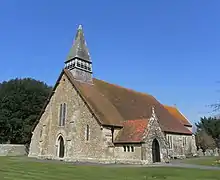 The church has a chalice dating from Elizabethan times and also an ancient font. The architect Ian Nairn, dated the font as being constructed at around 1100.[16] However, this was seen as a little early by other historians. The font, which is made of Purbeck marble, Heron-Allen suggests was of a type that was very common in the south east counties in the 12th century, having shallow bodies with circular basins standing upon a square base and supported by a large central and small angle shafts.[17] The architect Philip Mainwaring Johnston was responsible for the reredos.[18] The church is a Grade II listed building.[19]