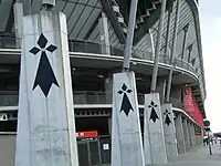 The section of the stadium popularly called Tribune Mordelles is occupied by the Roazhon Celtic Kop (RCK). Although the group was founded in 1991, its roots date back to 1987 when a group of supporters known as Ultras Roazhon was formed. The RCK was formed by three young supporters who decided to establish the Mordelles stand as the true hot spot of the stadium.[12] The group marks its presence not only through continuous singing and the use of flares, but also through numerous tifos and choreographic celebrations. The Breton identity is regularly displayed and the use of Celtic symbols is frequent.[13] A special feat of the RCK is that the group is responsible for having made the largest Gwenn-ha-du in history measuring 270 square metres. It was displayed at the Mordelles stand during the 1994–95 season.[14]