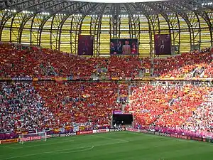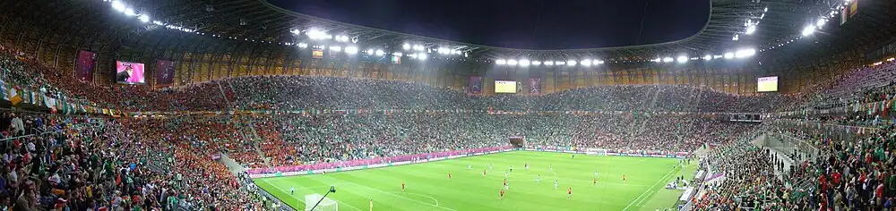 The stadium was also one of the designated venues for the finals of UEFA Euro 2012. It hosted four matches during the tournament; three matches in Group C and one quarter-final match were played there.[7] It was originally scheduled to host the 2020 UEFA Europa League Final,[8] however following the COVID-19 pandemic in Europe the final was postponed and later rescheduled to August at the RheinEnergieStadion in Germany behind closed doors; Gdańsk hosted the 2021 final instead.[9] Villarreal won the match, defeating Manchester United 12–11 on the penalty shootout.