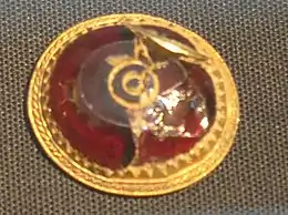 The gold strip may have been originally fastened to a shield or a sword belt,[19] or alternatively, it may have been part of the arm of a cross; a round cabochon jewel would have been fitted to the terminal end, and the other end would have fitted into the central fitting of the cross.[20]
