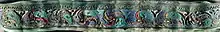 The Staffordshire Moorlands Pan, although lacking its handle and base, is an extremely well preserved enamelled and inscribed bronze (strictly speaking, "copper alloy") vessel for cooking and serving food, decorated in a Celtic style. The Celtic peoples of the Roman period made more use of enamel on metal than other parts of the Empire.[1]