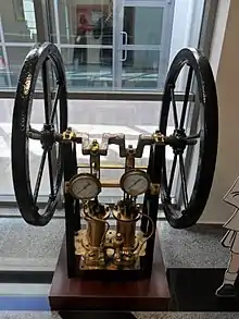 The lever action pump, with one or two cylinders and single or double ended lever, was a modification using pistons in cylinders in place of the bellows, but otherwise worked in the same way.[19] Cranked pumps, with one to three cylinders, single or double action, were a development of cylinder pumps which used a crankshaft to drive the pistons, and handles on flywheels to operate the crankshaft. The use of flywheels, multiple cylinders and double-action cylinders would make it easier for the operators to produce a smooth airflow at relatively constant effort.[20][21]