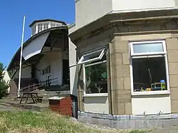 ![]() 1930s club house (centre), offices (right) and observation/control tower (top) taken from the airfield site in June 2009. It was used as an elephant enclosure for a while but then changed to camels to give the elephants more space. | |||||||||||