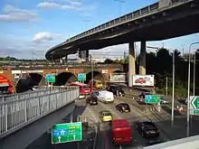 The format of the Staples Corner junction was modified during the reconstruction works necessitated by the bombings. An additional sliproad onto the M1 from the east was added to remove the need for traffic coming from that direction to travel around the roundabout to access the motorway.