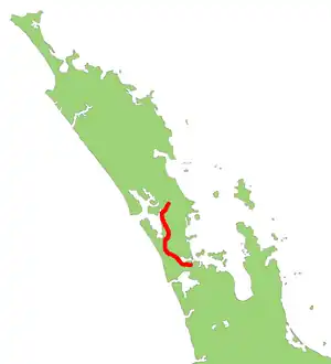SH 16 begins in Central Auckland at the corner of The Strand, Tamaki Drive and Quay Street, directly opposite the Port of Auckland. It travels south via The Strand where it reaches the lights at Beach Road and Parnell Rise where it changes to Stanley Street. After one more set of lights at Alten Road, SH 16 becomes coextensive with the Auckland Northwestern Motorway. The highway travels through the Central Motorway Junction where there are exits to SH 1 both northbound and southbound. It then runs west and forms a junction with SH 20 and then continues to West Auckland over a causeway crossing Traherne Island and the Whau Estuary. SH 16 then passes through West Auckland and past the junction with SH 18 (Upper Harbour Motorway) where it can be accessed by northbound traffic. The Northwestern Motorway terminates at a roundabout with Brigham Creek Road and Fred Taylor Drive. From here SH 16 reverts to single carriage road. It passes through the communities of Kumeū, Huapai, Waimauku and Helensville, eventually reaching the west coast. From there on SH 16 skirts the Kaipara Harbour along the Kaipara Coast Highway, eventually bearing northeast to meet SH 1 at Wellsford, where it terminates.[1]