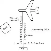 A visiting head of state or chief of government will typically arrive, via aircraft, at Joint Base Andrews. When the visitor's aircraft has completed taxiing, a ground crew will move air stairs into position at the aircraft's door and unroll a red carpet. A military cordon, consisting of an approximately equal number of personnel from the 3rd United States Infantry Regiment, the U.S. Navy Ceremonial Guard, the U.S. Coast Guard Ceremonial Honor Guard, and the U.S. Air Force Honor Guard will form, flanking either side of the red carpet. For visiting heads-of-state the cordon will consist of 21-personnel, for chiefs of government, nineteen. In front of the cordon, closer to the aircraft stairs, a welcoming committee will form in a line. Two officers from the Joint Colour Guard will hold sticks attached to the flag of the United States and the flag of the visiting country. The welcoming committee consists of the United States Chief of Protocol, the United States ambassador to the visiting state, the visiting state's ambassador to the United States, the commanding general of Joint Base Andrews, and two or three prominent personages designated by the Chief of Protocol.[15]