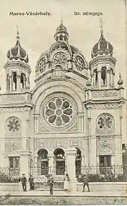The grand synagogue in Târgu Mureș was built in 1899–1900 -during the austro-Hungarian period, in an eclectic architectural style, following plans provided by the Viennese architect Jakob Gartner, of Moravian descent. The builder of the building was a notable mason and entrepreneur, Pál Soós.[6] The start of construction of the synagogue at the end of the 19th century signaled, for the "Status Quo" Jewish community of Târgu Mureș, a definitive detachment from the Orthodox Jewish community in the rest of Transylvania.