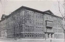 The first official high school building opened on the northwest corner of East North and North Broadway Streets in the fall of 1869 (today Broadway Street is known as Martin Luther King (MLK) Drive). A class of eight graduated in 1870, but there were no graduates in 1871, because the course of study was lengthened to four years. The student population was expanding in the latter part of the 1800s, and building additions were made in 1892 and 1895.[3] A portion of this 19th century building still existed into the late 1970s, when it was razed to make room for the grounds expansion of St. Patrick's Roman Catholic School, which stood between the two buildings.