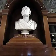 A rare silhouette portrait of Stephen Mitchell as a younger man was donated to the Mitchell Library on 18 March 2015 by Lord Nimmo Smith,[9] one of his cousins having been the direct descendant of Stephen Mitchell’s brother. A copy of this silhouette was lent by Mrs. Tod of Moffat[27] - née Dorothea Thomson (1831-1894), the widow of Stephen's nephew, James Thomas (1827-1865) - to sculptor John Mossman (1817-1890) for the purpose of creating a portrait bust in clay; apart from that, Mossman had only a single photograph of Stephen Mitchell, shown with a book on a table beside him, from which to work. Commissioned posthumously by the City Council, Mossman's finished marble commemorative bust was completed in 1881, and is on display at the entrance to the Mitchell Library at 201 North Street.[28] A contemporary account describes how it was received:
