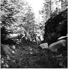 The Stevens Pass Historic District is an area within a large rectangle 3.2 by 18.2 miles (5.1 by 29.3 km) and extends from the Martin Creek Tunnel on the western slope of the crest to the eastern portal of the present Cascade Tunnel above Nason Creek on the eastern slope. The area is ruggedly mountainous and the terrain is covered with timber and granitic outcroppings. The Cascade Range interfered with the Great Northern Railway effort to develop a deep water western terminus in Puget Sound. A gap in the Cascade Range, at Stevens Pass, was found suitable at an elevation slightly in excess of 4,000 feet (1,200 m) about 45 miles (72 km) east of Seattle. The first effort an elaborate switchback system, replaced by a tunnel which was itself replaced by a second tunnel.[2]