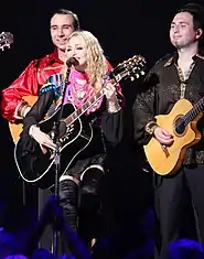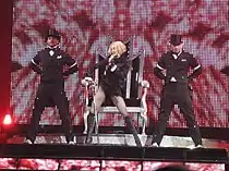 Designers working on the tour include Arianne Phillips, Riccardo Tisci for Givenchy, Stella McCartney, and Jeremy Scott, among others.[34] For the first act, Pimp, Madonna wore clothes created by Givenchy; a reference to gangsta pimp, Art Deco and her "longest-running fashion inspiration", the dominatrix, this look consisted of a frock coat in black stretch satin, trimmed with pleated black silk organza and embroidered with jet beads, as well as a black satin waistcoat trimmed with black silk fringes.[35] She also wore thigh-high boots by Stella McCartney.[36] Created for the Old School segment, Jeremy Scott's outfit was a nod to the singer's early days in 1980s New York, and included custom sneakers decorated with art by Keith Haring. Scott recalled that "[Haring] and Madonna were friends. If he were alive, it would be his 50th birthday as well. So I thought, 'What if we revisited that?'".[37][36] Tisci also created the clothes for the Gypsy act, which featured a long-hooded cape in black silk taffeta, lined in fuchsia silk taffeta and embroidered with jet stones, and a black stretch chiffon dress trimmed with multi-colored ribbons and fuchsia colored metal chains, worn with a matching necklace.[35] The final act, Rave, had "lots of Japanese influences", with the singer wearing sequined shoulder pads.[37][38] Additional clothes included shoes by Miu Miu, Moschino sunglasses and accessories by Roberto Cavalli; Tom Ford created bespoke clothes for the band.[34][36] Arianne Phillips concluded that "[Madonna] always wants to push the envelope. There are no vanity considerations based on her age [...] She looks good in everything".[37]