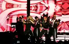 Several changes were made for the 2009 extension; Green Pink Caviar was used as backdrop during the opening "Candy Shop", which also saw Madonna dressed in the new Givenchy outfit.[31][40] "Heartbeat" was replaced by "Holiday", which incorporated elements of her then-latest single "Celebration", and her first single "Everybody".[41] The number included a tribute to Michael Jackson, who had passed shortly before the tour began;[42] a medley of his songs "Billie Jean" and "Wanna Be Startin' Something" played as dancer Kento Mori, dressed in Jackson's trademark black and white outfit, with a wide-brimmed hat and white gloves, began performing his most famous moves, including moonwalking across the stage.[43] "Dress You Up" replaced "Borderline"; it featured musical elements of the Knack's "My Sharona" and "God Save the Queen" by the Sex Pistols.[41] "Hung Up" was removed and instead, a house rendition of "Frozen" was performed.[44][45] It sampled Calvin Harris' "I'm Not Alone" and included lyrical elements of Madonna's own "Open Your Heart";[46][22] video outtakes from the song's music video, directed by Chris Cunningham, were used as backdrops during this performance.[47] On the screens, the phrase "If you want to make the world a better place look inside yourself and make a change", taken from Jackson's 1988 song "Man in the Mirror", flashed before the performance of "Ray of Light"; for the encore of "Give It 2 Me", Madonna and her dancers all donned jeweled gloves on their right hand, another nod to Jackson.[48]