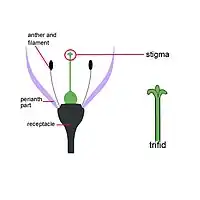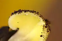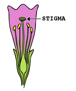 The stigma receives pollen and it is on the stigma that the pollen grain germinates. Often sticky, the stigma is adapted in various ways to catch and trap pollen with various hairs, flaps, or sculpturings.[3] The pollen may be captured from the air (wind-borne pollen, anemophily), from visiting insects or other animals (biotic pollination), or in rare cases from surrounding water (hydrophily). Stigma can vary from long and slender to globe shaped to feathery.[4]