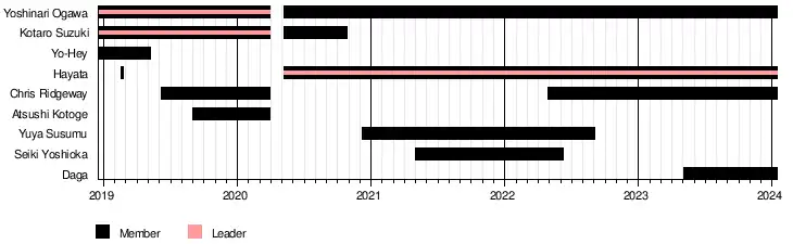 At Noah The New Year 2023 on January 1, Yoshinari Ogawa teamed up with Eita to win the GHC Junior Heavyweight Tag Team Championship.[27] At The Great Muta Final "Bye-Bye" on January 22, 2023, Seiki Yoshioka teamed up with Atsushi Kotoge in a losing effort against Kongo (Hajime Ohara and Hi69), and Yoshinari Ogawa teamed up with Eita and Nosawa Rongai in a losing effort against Junta Miyawaki, Alejandro and Yasutaka Yano.[28] At Noah Majestic 2023 on May 4, Daga joined the unit after betraying Eita and aligning himself with Ogawa and Ridgeway.[29]