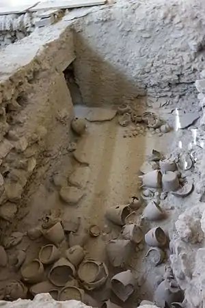 A stirrup jar is a type of pot associated with the culture of Mycenaean Greece. They have small squat bodies, a pouring spout, and a second nonfunctioning spout over which the handles connect like a stirrup. During the Late Bronze Age, they were used in the export of oils, and are found in large numbers at sites around the Eastern Mediterranean and beyond.[2] The term "stirrup-jar" is a translation of German "Bügelkanne", the name assigned to them by Heinrich Schliemann who found the first instances during his excavations at Troy.