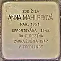 HERE LIVED ANNA MAHLEROVÁ BORN 1851 DEPORTED 1942 TO THERESIENSTADT MURDERED 19.10.1942 IN TREBLINKA |