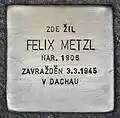 HERE LIVED FELIX METZL BORN 1909 MURDERED 3.3.1945 IN DACHAU |